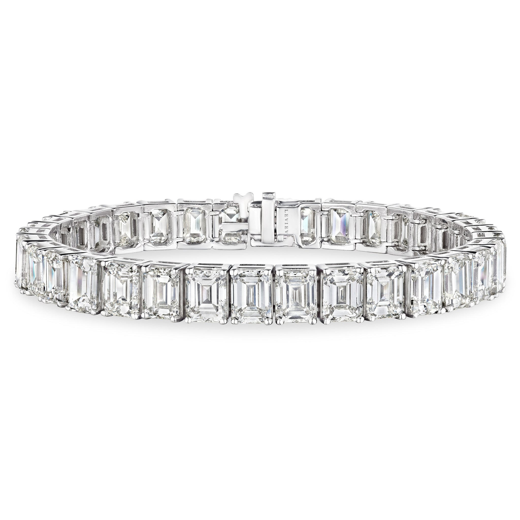 Meet the Emerald Cut Diamond Bracelet by Leviev , embodying pure elegance and sophistication. This resplendent piece nestles 34 sparkling diamonds, boasting an extraordinary 34.97 CT in total weight. These precious stones, each meticulously cut to perfection, radiate a mesmerizing appeal thanks to their 'I' color grade and 'VS' clarity. Imagine this gleaming bracelet resting gently on your wrist, reflecting the sunlight during the day or twinkling subtly under the evening lights. This bracelet doesn't just hold diamonds, it holds moments that you'll treasure forever.