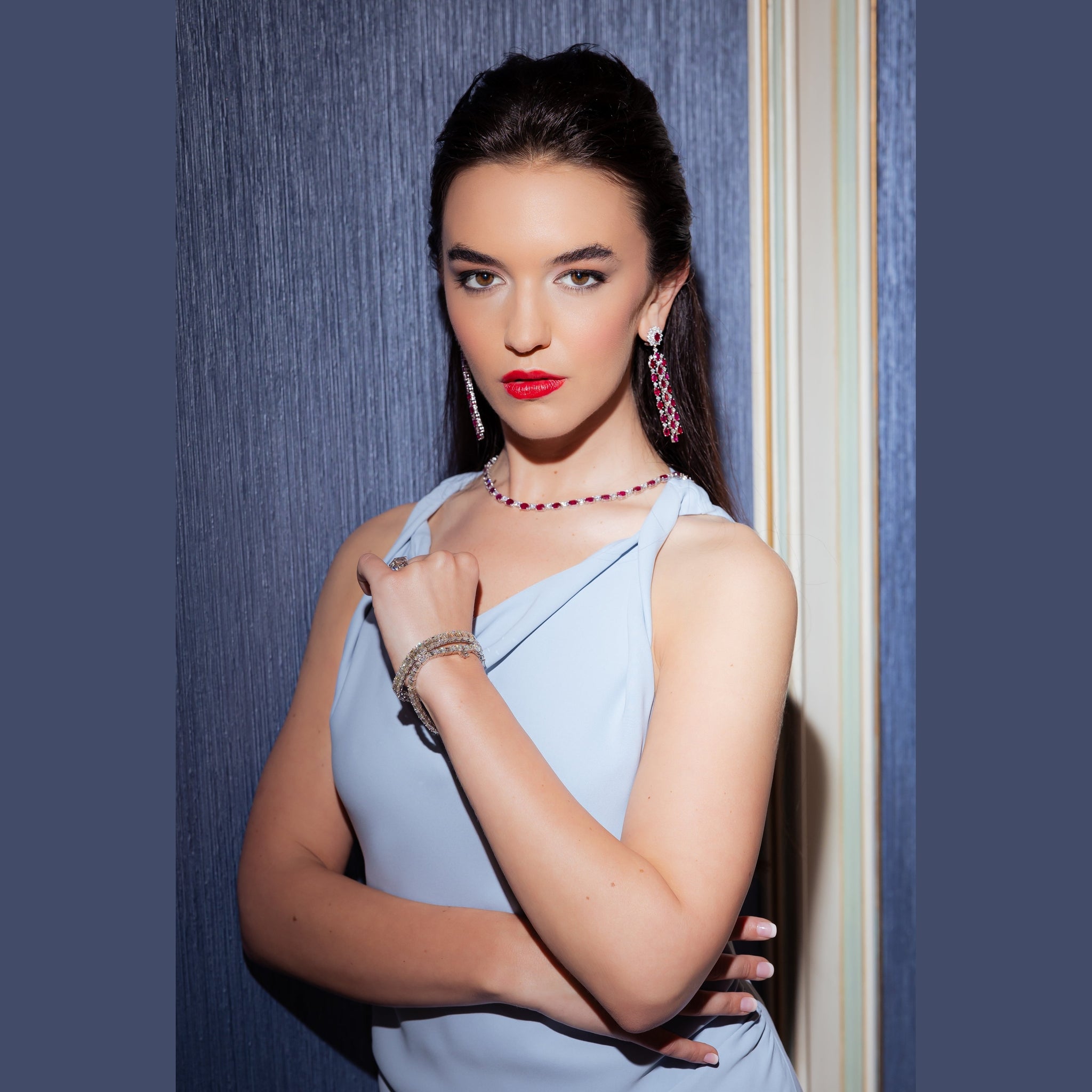 Each ruby reveals a vivid intensity, perfectly contrasted by the dazzling brilliance of hand-selected diamonds, promising an allure that captivates from every angle.