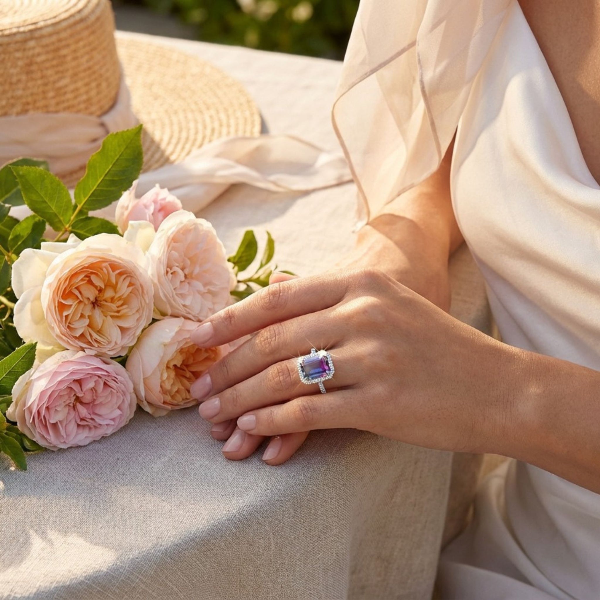 A masterful celebration of color and light, this Multicolor Tourmaline Halo Ring features a 3.13 carat emerald-cut multicolor tourmaline at its center, each facet reflecting a shifting spectrum of vibrant hues. Encircled by a halo of brilliant diamonds and complemented by a pavé-set platinum band, the design captures movement, radiance, and understated sophistication from every angle.